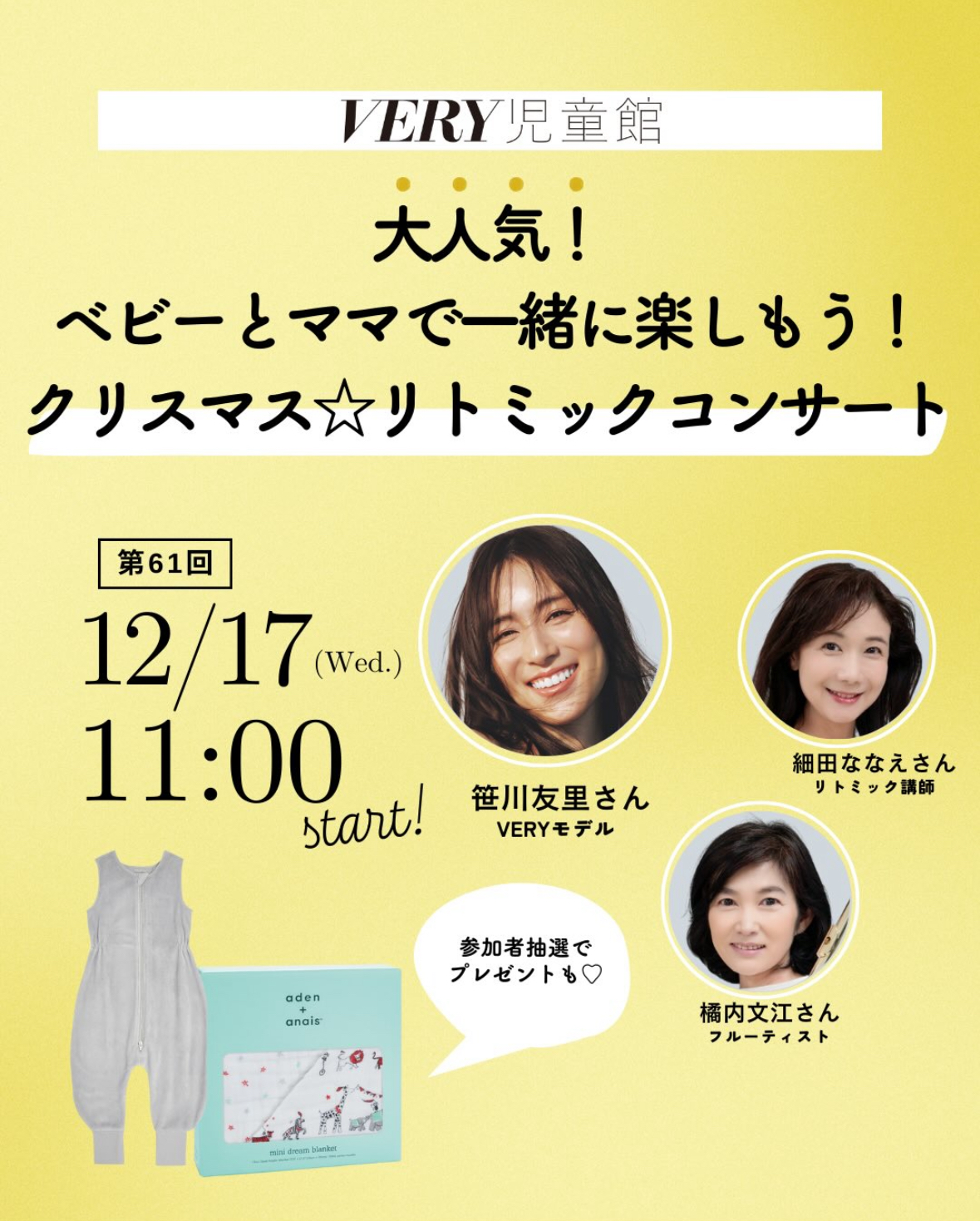 ゲストにVERYモデルの笹川友里さん、リトミック講師の細田ななえさん、フルーティストの橘内文江さん、ゲストピアニストの小林弘子さんをお迎えして、「大人気!ベビーとママで一緒に楽しもう!クリスマス☆リトミックコンサート」をお届けします🎅✨